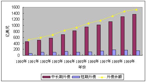 由图5-5可看出,中国外债增长幅度较大,外债规模不断扩大,从图中我们看到,外债余额一直呈增长势头。1999年外债余额相当于1990年余额的近3倍,从图中可以估计出1999年外债余额约1500亿美元,1990年约500亿美元。
