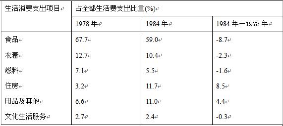 例如,对1984看农村居民各项生活消费支出占全部消费支出的比重与改革开放前的1978年进行比较,有关数据见表2-8: