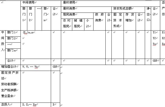 如上表中,假定经济系统包括n个部门,把上述产出的类别和投入的类别交叉联立,就形成投入产出表的四个象限。