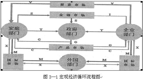 需要说明的是,图3―1的宏观经济循环流程图只代表一个社会经济运行的主流,大量的、非主流的经济运行均被略去。在宏观经济循环流程图中,连接各经济主体和市场的箭头均代表货币的流向和流量,产品和生产要素都是逆箭头方向运动的。图中的字母的含义,在下文中将分别给以说明。