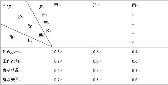 假定知识水平、工作能力、廉洁状况、群众关系四个方面对领导干部进行综合评价,参评单位有三位领导干部,评价步骤如下: