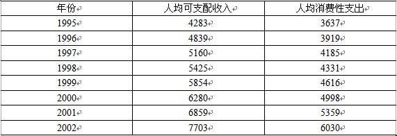 表3-1给出了某市城镇居民1995年至2002年期间各年度人均可支配收入和人均消费支出的数据。