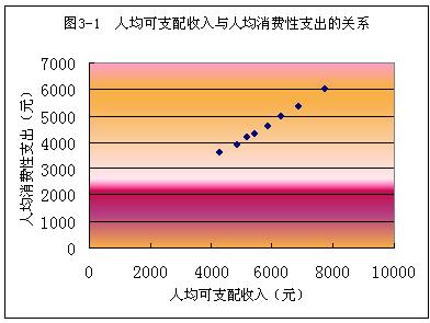 可通过散点图观察,如图3-1可见,随着人均可支配收入的增长,人均消费性支出明显地增长,这表明某市城镇居民1995年―2002年人均可支配收入和人均消费性支出之间存在显著的相关关系。