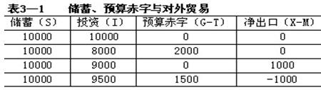 表3―1共有四行数据,代表了四种不同的经济形势。从第一行可以看出,假定储蓄为10000亿元,投资也为10000亿元,政府预算和对外贸易必须同时实现平衡,宏观经济运行才能实现均衡。第二行表明,如果储蓄仍为10000亿元,但在政府预算出现2000亿元赤字的情况下,企业部门必须减少2000亿元的投资,即总投资为8000亿元时,宏观经济才能实现均衡。在第三行,对外贸易出现了1000亿元的顺差,这意味着外国部门对国内的产品具有强劲的需求,为实现宏观经济均衡,这时企业部门只能把投资减少到9000亿元。最后一行告诉我们,如果储蓄还是10000亿元,但投资为9500亿元,政府赤字为1500亿元,为满足国内的强劲需求,实现宏观经济的均衡,就必须增加进口,以致出现了1000亿元的外贸逆差,这是实现宏观经济均衡必不可少的。