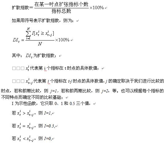 在宏观经济波动的任何一段时间内,各经济指标所表现出的状态都是不尽相同的,有些指标处于扩张状态,有些指标已经达到峰值,而有些指标则已处于收缩状态或已达到谷值。所谓扩散指数又叫扩散率,它是在对各个经济指标的循环波动进行测定的基础上所得到的在一定时点上处于扩张状态的经济指标(扩张指标)的百分比,即: