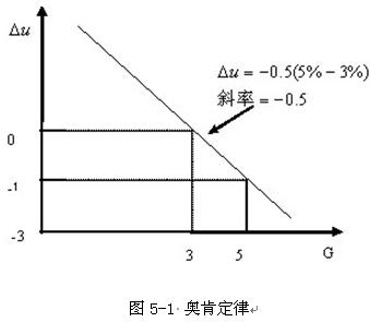 在一个用纵轴表示失业率变动的百分比,用横轴表示实际经济增长率的坐标中,奥肯定律是一条斜率为负的曲线。如图5-1所示。