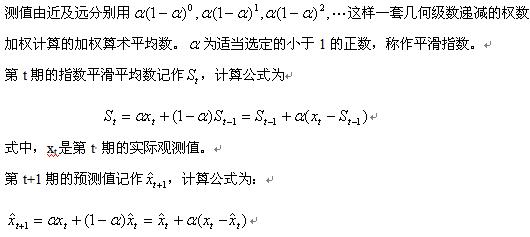 第t期的指数平滑平均数是第t期观测值和第t-1期指数平滑平均数的加权算术平均数,权数分别为 ;第t-1期的指数平滑平均数则是第t-1期的观测值和第t-2期指数平滑平均数的加权算术平均数,权数分别为 等等。