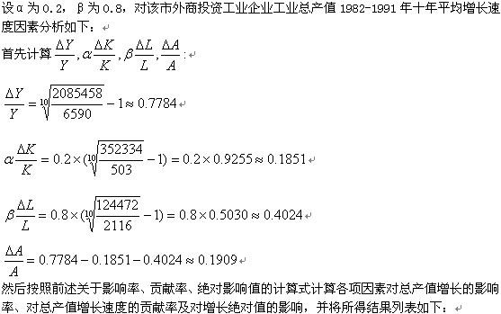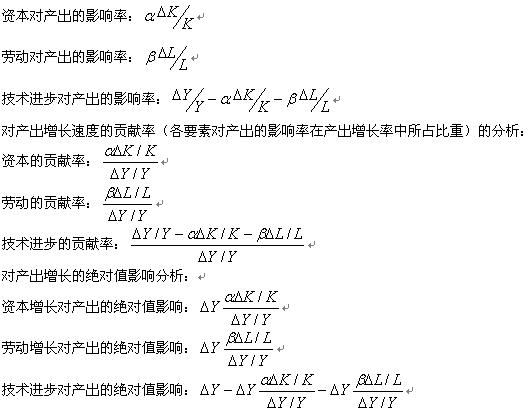 利用增长速度方程,当我们求出资本和劳动的产出弹性的具体数值后,就可能通过以下因素分析式从影响率、贡献率、绝对影响值几个角度分析资本、劳动和技术进步对产出增长的影响了。