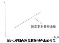 在图7―1中,纵轴表示通货膨胀率,横轴表示经济增长率(G)和就业率(N),坐标中斜率为正的曲线表示经济增长率与通货膨胀率之间的正相关关系,亦即产出水平与价格水平的正相关关系。由于就业率与经济增长率是正相关的,因此,坐标中的曲线也表示就业率与通货膨胀率之间的正相关关系。如果我们把图7―1坐标的横轴表示为失业率,就会得到一条斜率为负的曲线,这条斜率为负的曲线就是我们在第五章中给出的短期菲利普斯曲线。短期菲利普斯曲线所表示的是失业率与通货膨胀率之间的负相关关系。由于图7―1中斜率为正的曲线与第五章中的图5―2中斜率为负的曲线所表示的意思相同,因此,图7―1中斜率为正的曲线也称为短期菲利普斯曲线。