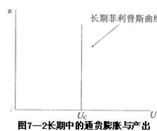在图7―2的坐标中,纵轴表示通货膨胀率,横轴表示失业率,坐标中垂直于横轴的垂线被称为长期菲利普斯曲线。垂直的长期菲利普斯曲线表明,在长期中,无论价格水平怎样变动,失业率均为自然失业率()不变,如第三章和第五章所述,在只存在自然失业率的条件下即实现了充分就业的条件下所实现的产出水平实际上就是潜在的产出水平。因此,图7―2中的垂线不仅意味着自然失业率或充分就业的就业率与价格水平无关,也意味着潜在产出水平与价格水平无关。在长期中,潜在产出与价格水平之所以无关,是因为潜在产出水平取决于生产要素的投入数量和生产要素的效率,而不是取决于价格水平。