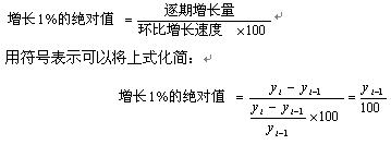 速度指标的数值与基数的大小有密切关系。环比增长速度时间数列中,各期的基数不同。因此运用这一指标反映现象增长的快慢时,往往要结合水平指标的分析才能得出正确结论。“增长1%的绝对值”是进行这一分析的指标。它反映同样的增长速度在不同时间条件下所包含的绝对水平。计算公式为: