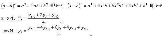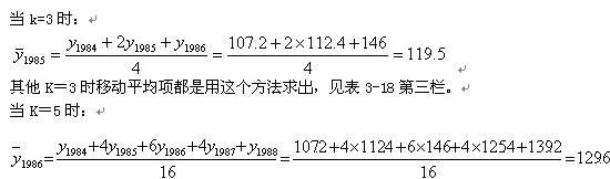 注意:当k取奇数或偶数的不同形式时,处理方法有区别。对于k取奇数时,可直接运用公式(3?21)即可;当k取偶数时,要在第一次对原数列作移动平均后,对所得新数列再做一次相邻两项的移动平均,这样才能完成中心化。