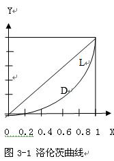绘制洛伦茨曲线图的基本思路是:(1)将所调查住户按人均收入水平由低到高顺序排列,分成若干组;(2)计算各级遍数或人数所占比重,在此基础上计算截止到本组的累计户数或人数比重,同时计算每组收入占总收入的比重以及截止本组的累计户数或人数比重,显然,最后一组的累计比重为1即100%;(3)以户数或人数累计比重为X轴,以收入累计比重为Y轴,形成坐标图,按照各级实际户数(或人数)累计比重和收入累计比重数据一一对应,标识于图上,形成系列的点,将这些点连接在一起所得到的平滑曲线即洛伦茨曲线。图3-1是洛伦茨曲线的常见的形式。