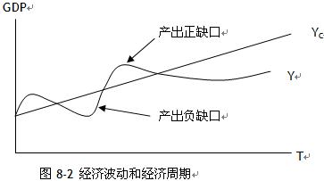 虽然一个国家在一个持续长的时期内都存在着一个相对稳定的长期经济增长趋势,但这并不排除实际经济运行在短期内会偏离这个趋势,有时,它可能在趋势线的上方运行,而在另外的时候,它又可能回到趋势线附近或跌到趋势线的下方。实际经济运行与长期经济增长趋势的偏离即为经济波动。并且,这种经济波动具有周期性,我们把周期性的经济波动称为经济周期,如图8-2所示。