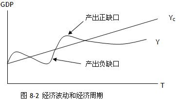 图中纵轴表示产出水平,横轴表示以年为单位的时间。坐标中的曲线(Y线)即为实际经济运行曲线,曲线上的任意一点都表示一个国家在某一时期的实际总产出,Yc线为长期经济增长趋势线,线上任意一点都表示一个国家在一定时期的潜在产出水平。当实际产出水平高于潜在产出水平时,经济中存在着一个产出正缺口,而当实际产出水平低于潜在产出水平时,经济中则存在着一个产出负缺口。