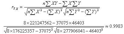 由计算结果可以看出,某市城镇居民1995年―2002年人均可支配收入和人均消费性支出之间的相关系数为0.9983,存在很强的正相关关系。
