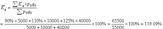 解:根据表4-4的资料,计算三种食品的销售量总指数应采用加权算术平均指数形式,以基期销售额作为权数,即