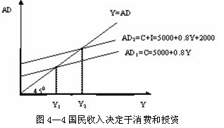 在图4―4中,总需求曲线AD1线只包括消费需求,它与450线相交所决定的均衡产出为Y1。总需求曲线AD2线包括消费需求和投资需求,它与450线相交所决定的均衡产出为Y2。根据(4.1)式所给出的数据(自发消费5000亿元,投资2000亿元),均衡产出Y1应为25000亿元=[5000/(1-0.8)],Y2为35000亿元=[(5000+2000)/(1-0.8)]。