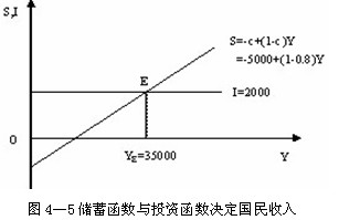在图4―5中,假设投资是一个常数,与收入水平无关,因此是一条水平线。由于产品市场均衡的条件是I=S,因此,水平的投资曲线与斜率为正的储蓄曲线相交的E点即为产品市场的均衡点,与之相对应的YE即为均衡产出。当投资为2000亿元时,在产品市场均衡的条件下,储蓄也应为2000亿元。将S=2000代入储蓄函数S=-5000+(1-0.8)Y,就可以求出均衡产出为35000亿元。