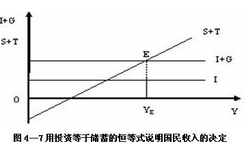 在图4―7中,支出都是一个常数,与收入水平无关,因此是一条水平线,即(I+G)线,它与投资曲线I线的垂直距离即为政府支出G。由于产品市场均衡的条件是:I+G=S+T,因此,水平的投资和政府支出曲线(I+G)与斜率为正的储蓄和税收曲线(S+T)相交的E点即为产品市场的均衡点,与之相对应的YE即为均衡产出。