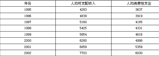 表3-1给出了某市城镇居民1995年至2002年期间各年度人均可支配收入和人均消费支出的数据。