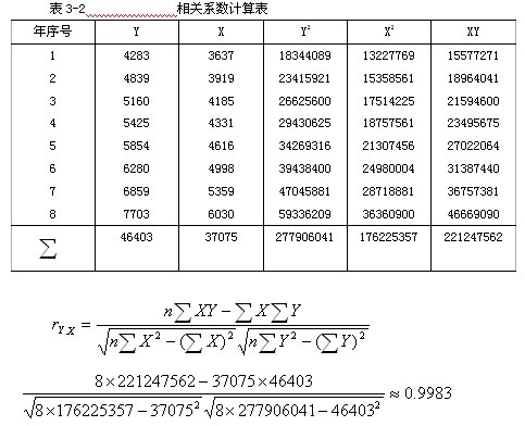 由计算结果可以看出,某市城镇居民1995年―2002年人均可支配收入和人均消费性支出之间的相关系数为0.9983,存在很强的正相关关系。