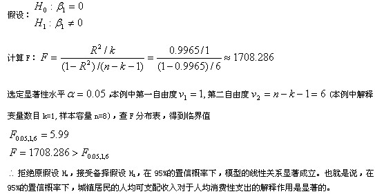 结果表明,在Y的总变差中,有99.65%可以由解释变量X(或回归方程)做出解释,回归方程对于样本观测点拟合良好。也就是说,城镇居民人均消费性支出的变化,有99.65%是由人均可支配收入决定的。