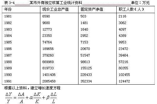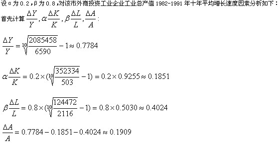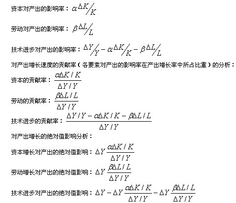 利用增长速度方程,当我们求出资本和劳动的产出弹性的具体数值后,就可能通过以下因素分析式从影响率、贡献率、绝对影响值几个角度分析资本、劳动和技术进步对产出增长的影响了。