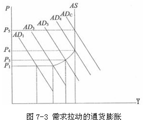 从图7―3中我们可以看到,总供给曲线AS起初保持水平,当总需求曲线为AD1线时,它与总供给曲线的交点所决定的产出水平为Y1,价格水平为P1。当总需求增加,即从AD1线右移到AD2线时,产出水平从Y1增加到Y2,但这时总需求的增加并未引起物价水平的上涨,价格水平仍保持在P1。当总需求继续增加到AD3线乃至增加到AD4线时,虽然产出水平仍然会继续增加到Y3和Yc,但价格水平也会相应上涨到P3和P4,这时的价格水平上升就是所谓的半通货膨胀或爬行式通货膨胀。之所以会出现半通货膨胀,原因就在于,当由总需求拉动的经济增长过快时,就会导致某些资源的供给出现相对不足,即出现经济增长中的瓶颈现象,从而引起价格水平上涨。图7―3显示,当总需求曲线为AD4线时,产出水平为Yc,Yc为潜在产出水平。当实际产出达到潜在产出水平时,意味着资源已经被充分利用即社会实现了充分就业,总供给曲线AS线将呈现垂直状态。这时,如果总需求继续增加,例如增加到AD5时,总供给将不会随之增加,产出水平将不再增长,但价格水平将被拉升到P5,这时的价格上涨就是完全的通货膨胀。可见,当总需求的增加超过资源的供给能力时,就会引起需求拉动的通货膨胀。