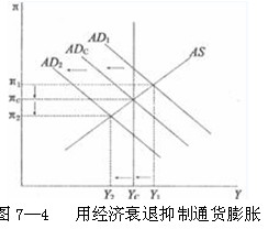 这是一项反需求拉动通货膨胀的经济政策。由于需求拉动通货膨胀的起因是过度需求,因此,只要抑制总需求,就可以达到抑制通货膨胀的目的。在政策上,政府可以通过实行紧缩性的财政政策和紧缩性的货币政策来实现。实行紧缩性的财政政策意味着要减少政府支出或增加税收,实行紧缩性的货币政策意味着应当抽紧银根,减少货币供给量,提高利率。实行紧缩性的财政政策和紧缩性的货币政策,会导致消费需求、投资需求、政府需求和来自国外的需求即净出口的减少,从而导致总需求的减少。在总供给水平不变的情况下,总需求的减少会导致价格水平的降低,从而对通货膨胀起到抑制作用。但这也会导致产出水平的下降,从而引起经济衰退。如图7―4所示。