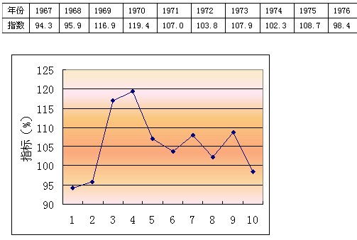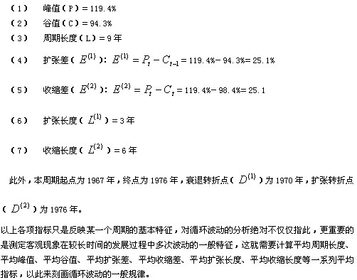 我国1967-1976年国内生产总值指数呈现为一周期波动,现参照表4-3和图4-2计算以上循环波动测定指标。