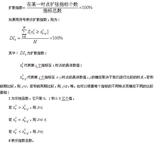 在宏观经济波动的任何一段时间内,各经济指标所表现出的状态都是不尽相同的,有些指标处于扩张状态,有些指标已经达到峰值,而有些指标则已处于收缩状态或已达到谷值。所谓扩散指数又叫扩散率,它是在对各个经济指标的循环波动进行测定的基础上所得到的在一定时点上处于扩张状态的
