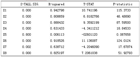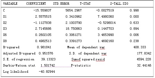 由表4中的结果我们不难看出,解释变量X5的t检验、F检验均未通过,首先剔除变量X5。X4与X7的t检验、F检验虽然都通过,但X4的 ,X7的 ,显然与Y的拟合程度不好,将其剔除。