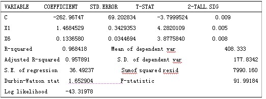 上表显示,X1与X6的t检验、F检验均通过,并且 ,拟合优度很高,因此,最终选取这两个变量构成模型,模型的方程式如下: