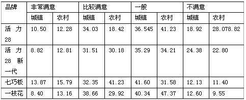 城镇居民对包装满意的“活力28”占65.55%,“一枝花”占47.90%。调查中,一些居民告诉我们,他们对“活力28”的包装很欣赏,不仅包装上采用了袋装,而且还有适合消费心理的大小桶装,更加出色的是它具有里外两层防潮的特点。