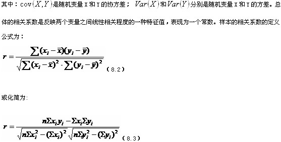 相关系数是测定变量之间关系密切程度的量。对两个变量之间的线性相关程度的度量称为单相关系数。通常以 表示总体的相关系数,以r表示样本的相关系数。