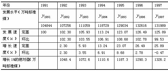 例9 我国1991-1997年能源生产量列于表3-12,根据这些资料计算的发展速度、增长速度及增长1%的绝对值也列于该表中。
