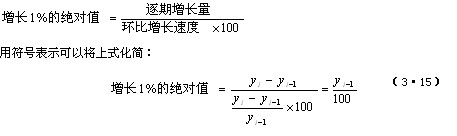 速度指标的数值与基数的大小有密切关系。环比增长速度时间数列中,各期的基数不同。因此运用这一指标反映现象增长的快慢时,往往要结合水平指标的分析才能得出正确结论。“增长1%的绝对值”是进行这一分析的指标。它反映同样的增长速度在不同时间条件下所包含的绝对水平。计算公式为:
