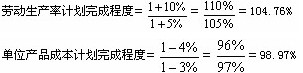例5:某工业企业1998年工人劳动生产率计划提高5%,单位产品成本计划降低3%。实际上工作劳动生产率提高10%,单位产品成本降低4%。则