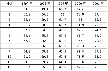 例12: 一家贸易公司经营产品的外销业务,为了合理的组织货源,需要了解外销订单的变化状况。下表是1997-2001年各月份外销订单金额。