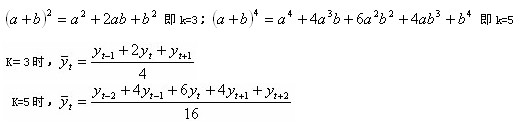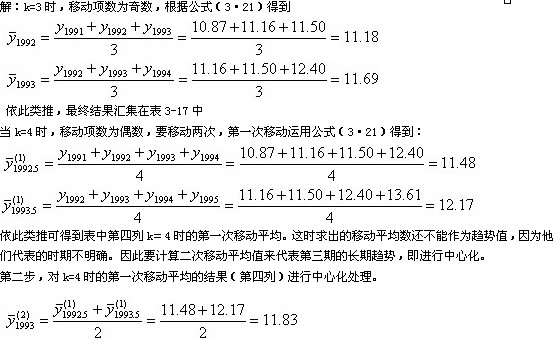 注意:当k取奇数或偶数的不同形式时,处理方法有区别。对于k取奇数时,可直接运用公式(3?21)即可;当k取偶数时,要在第一次对原数列作移动平均后,对所得新数列再做一次相邻两项的移动平均,这样才能完成中心化。
