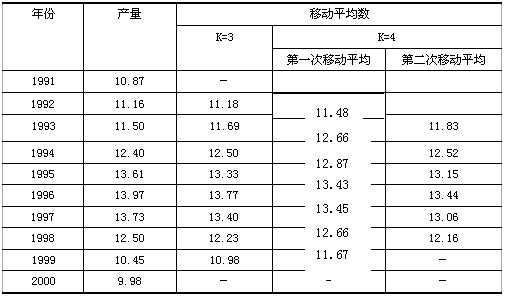 例13:下表是1991-2000年我国的原煤产量数据,计算移动项数k=3,k=4时的反映趋势变动的新数列。