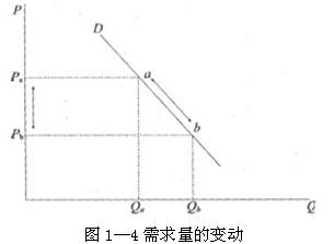在图1―4中,当商品价格从Pa下降到Pb时,需求量从Qa增加到Qb,或沿着D线由a点移动到b点;当商品价格从Pb上升到Pa时,需求量便相应地从Qb减少到Qa,或沿着D线由a点移动到b点。