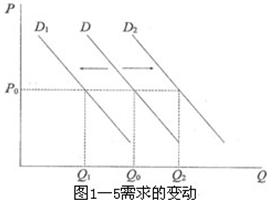 (2)需求与需求量不同。既然需求是指在某一特定的时期和各种可能的价格水平上,消费者愿意并且能够购买的商品数量,因此,需求不是指某一特定的需求量,而是指所有的特定的需求量的总和,即是说,它是一个完整的需求表。在坐标上,需求不是指需求曲线上的某一点,而是指整条需求曲线。与此相联系,需求的变动是指这样一种状态:即在假定商品自身价格不变的情况下,由于其他因素的变化所引起的、在每一可能的价格水平上需求量变化的全部情况。因此,需求的变动是指整个需求表的变化,在坐标上,它表现为整条需求曲线位置的移动。见图1―5。