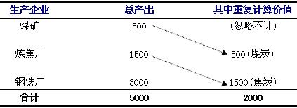 某煤矿某年采掘了价值500万元的煤炭,全部出售给炼焦厂;炼焦厂使用该煤炭做原材料,炼成价值1500万元的焦炭,将其出售给钢铁厂;钢铁厂使用该焦炭做为原材料,生产出价值为3000万元的钢材。容易看到,炼焦厂的1500万元的总产出中含有煤矿的50万元煤炭的价值,而钢铁厂的3000万元的总产出中又含在炼焦厂的1500万元焦炭的价值,此例中煤炭和焦炭都是中间产品。若将三个单位的总产出相加,得到5000万元,其中就包含了2000万元中间产品的重复计算(见表2-1)