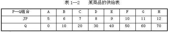 供给表所表示的是在一定时期内,在各种可能的价格水平上厂商愿意和能够出售的商品数量,即商品价格(P)与供给量(Q)之间的关系表。如表1―2所示。