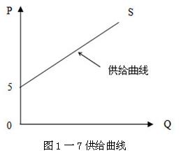 根据表l―2上的各种价格――供给量(P―Q)组合,可以在一个纵轴代表价格,横轴代表供给量的平面坐标上绘制一条供给曲线。见图1―7。