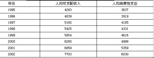表3-1给出了某市城镇居民1995年至2002年期间各年度人均可支配收入和人均消费支出的数据。