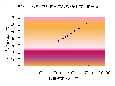 可通过散点图观察,如图3-1可见,随着人均可支配收入的增长,人均消费性支出明显地增长,这表明某市城镇居民1995年―2002年人均可支配收入和人均消费性支出之间存在显著的相关关系。