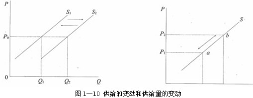 在图l―10(A)中,供给曲线由S1线移至S2线,从而引起了供给数量从Q1增加到 Q2,这意味着供给的增加;反之,当供给曲线由S2线移至S1线时,供给数量从Q2减少到 Q1,这意味着供给的减少。在图1―10(B)中,P―Q组合点从点a移至点b,这表示供给量增加;反之,从点b移至点a,则表示供给量减少。